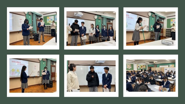 講演では、代表生徒6名が寸劇に挑戦し、日常に起こり得る場面を題材にしながら、対等な関係とは何かをより身近に感じて考えることができました。
