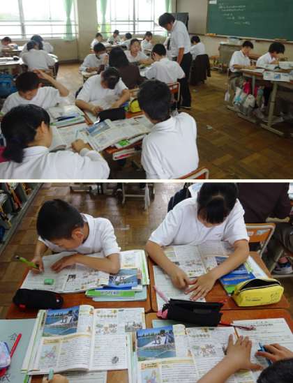3限の授業の様子です。上から、2組 社会、3組 音楽、4組 英語(ALTの先生と一緒に学習中)です。
