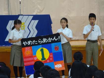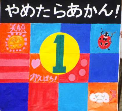一組は、一年生二名、二年生一名、三年生一名の四名です。学級目標は「やめたらあかん。笑顔と涙でがんばろう」です。絵の中のてんとう虫は、上へ上へと行く習性があるそうです。私たち一組もどんなことがあっても,上を向いていこうとてんとう虫の絵を描きました。続いてクラスアピールをしたいと思います。