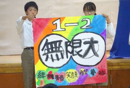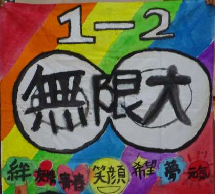 1年2組の学級目標は「無限大」です。この「無限大」の中には、1年2組の「絆、友情、青春、笑顔、希望、夢、元気」が無限大にあり続けたらいいなという思いで、この学級目標になりました。この学級目標通り、1年2組は特に笑顔と元気があふれています。授業では少しうるさすぎるくらいです。ノリが良く、元気で明るすぎるところが、1年2組の最大の良さであり、たまに悪いところです。けじめやメリハリをしっかりつけて授業を受けられるようにみんなで声かけ合わなければならないと思います。元気なだけじゃなくて、学年のため、学校のために、時には動ける行動力もあります。「壁が汚い」と問題になったとき1番に「みんなで掃除しよう!」と動くことができました。自分たちの良いところはこれからも大事にして、より良いクラスになっていけるように、みんなで声かけ合って頑張って生きます。