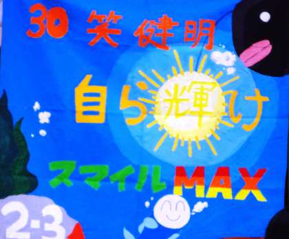 二年三組は学級目標は、「三十笑健明 自ら輝けスマイルMAX」です。学級目標の「三十笑健明」は、三十人全員が笑って、健康に毎日学校に来て、明るく過ごせるようにということを表しています。学級旗のアンコウは、学級目標の「自ら輝け」という部分を表しています。なぜ、この学級目標にしたかというと、今のクラスになってから、ずっと仲良く楽しくいつも笑って過ごしていたからです。帰りの会の時に、自分の班の良かった所、悪かった所を発表しているのですが、「給食を班の人数分を取ってきてくれた。」や「小テストで全員合格した。」などがあがっています。僕たち代表委員は、これからもクラスのみんなが仲良くて笑っていられるように、頑張って生きます。