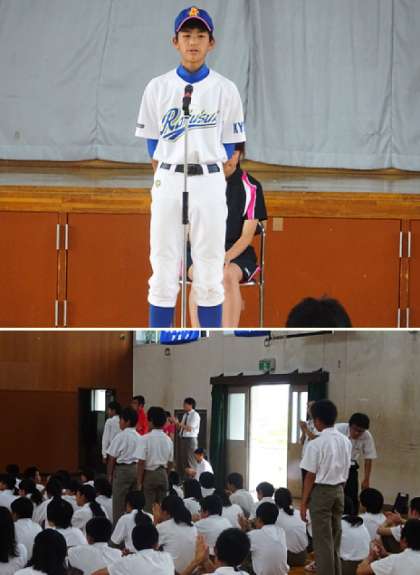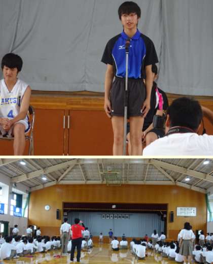 各部の部員が起立する中、キャプテンによる決意表明が行われました。野球部、サッカー部、卓球部の決意表明の様子です。