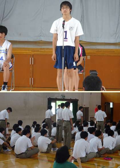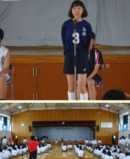 女子バレーボール部、男子バレーボール部、吹奏楽部の決意表明の様子です。