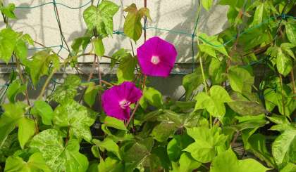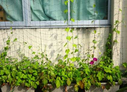 緑のカーテンまではまだまだのようですが、アサガオが咲きはじめました。