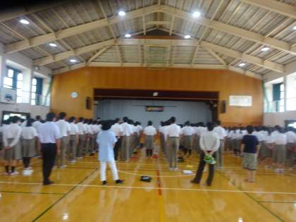 夏休み前の全校集会が行われました。まずは、校歌斉唱。