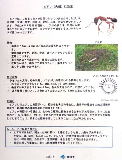 特定外来生物に指定されるヒアリについては、本年6月に兵庫県尼崎市で確認されて以降、兵庫県神戸市や大阪府大阪市など本市の近隣においても確認されているところにあり、現時点では、京都府下では確認例ございませんが、文科省より、ヒアリに注意するよう依頼が教育委員会を通じてありました。ホームページの右側の配布文書の中に啓発チラシ「ヒアリに注意」を掲載しました。ご確認下さい。こりらをクリックしていただいてもご覧いただけます。 → ヒアリに注意(ヒアリ啓発チラシ)