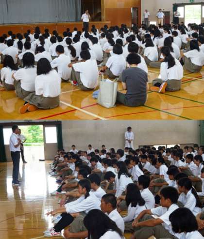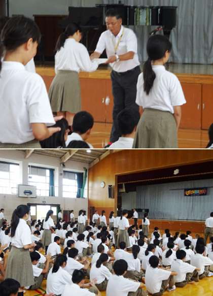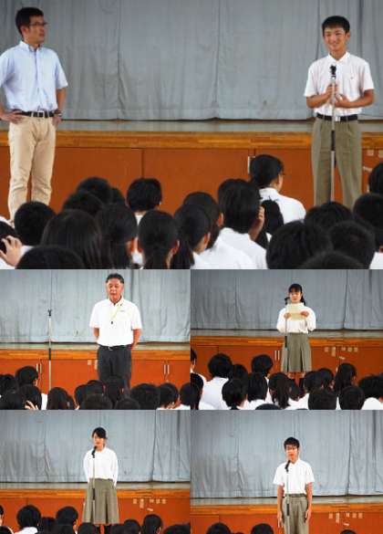 朝学活後、夏休み明けの集会が行われました。集会では、吹奏楽部の表彰、生徒会から2期の取組に向けての話、校長先生の話、生徒指導部からの話と続きました。みんな真剣に話を聞いていました。