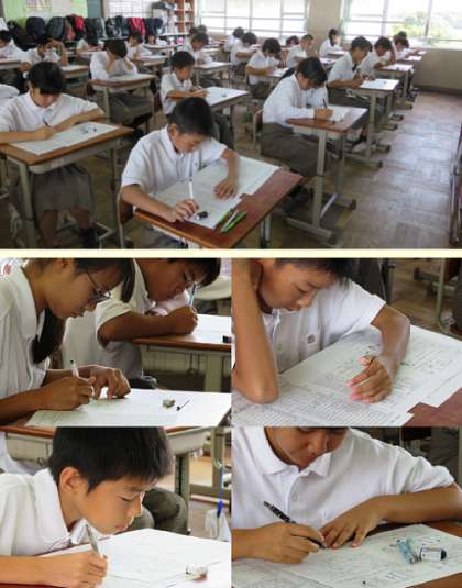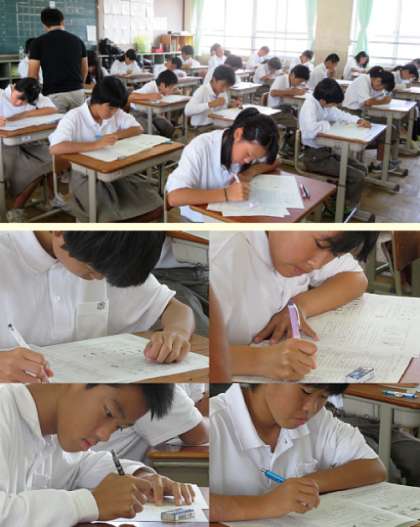 2限のテストは 1、2年が理科、3年が英語です。写真は1年の様子です。