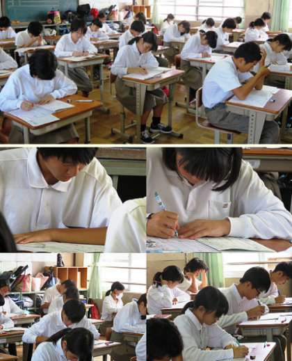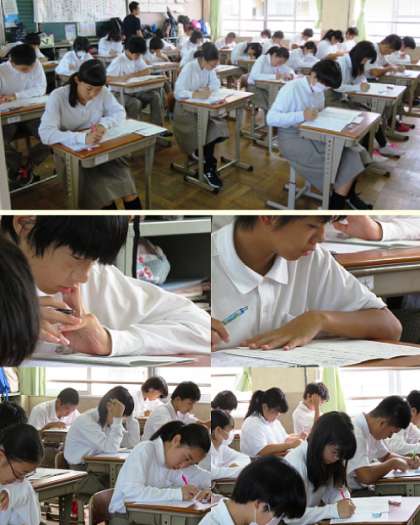 2年生の2限の国語のテストの様子です。上から、2組、3組、4組です。