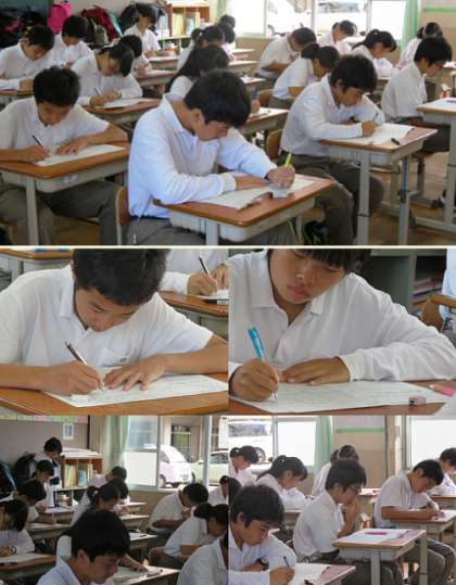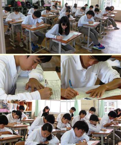 3年生の2限の数学のテストの様子です。上から、2組、3組、4組です。