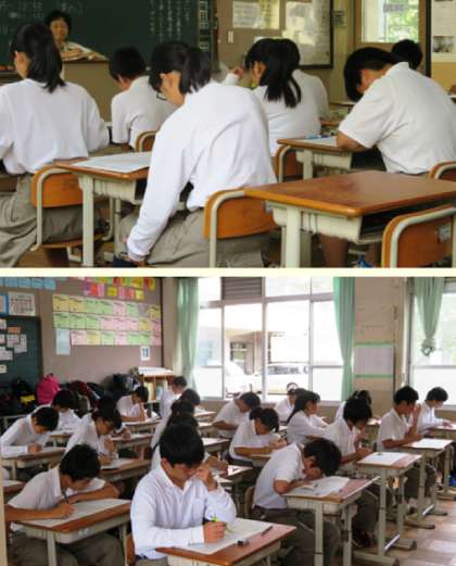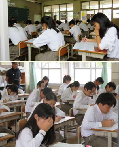 3限のテストは、1、2年が数学、3年が国語です。写真は3年の様子です。上から、2組、3組、4組です。