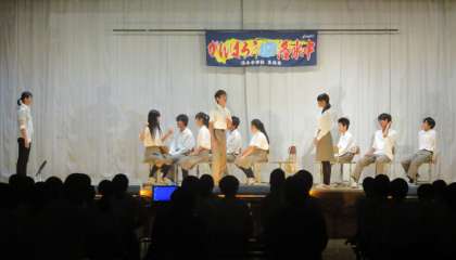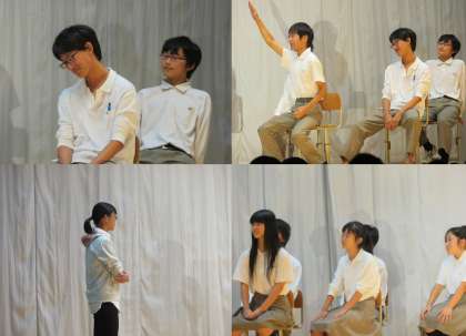 3年生の表現活動発表 学年劇(Lost colors 〜失われた色たち〜)の様子です。学年劇では「存在を消したい!」でも「生きたい!」と悩む少年とその仲間のコメディーでした。笑って楽しんでいただけたでしょうか。