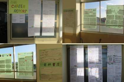 チャレンジ体験の各事業所で作成した報告ポスター、興味のある職業を個人的に調べた研究レポートを展示しました。体験と調査をもとに作成したポスターとレポートです。いかがでしたでしょうか。