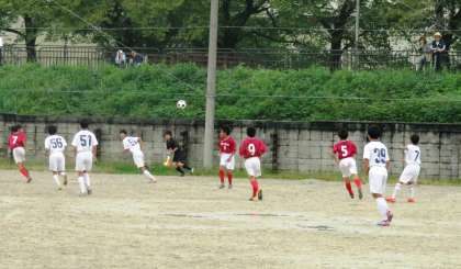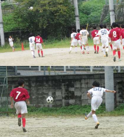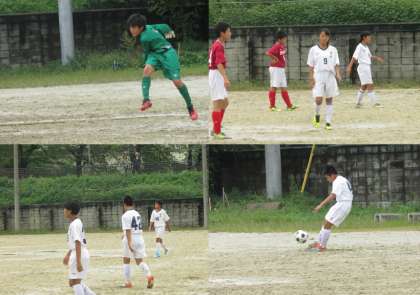 再三のチャンスも、シュート直前に水たまりでボールがとまりタイミングがずれてシュートができなかったり、シュートがゴールポストに当り相手GK(グレーのユニフォーム)に蹴り出されるなど、得点できませんでした。終始攻め続けましたが、2回のカウンターで得点を許し負けました。