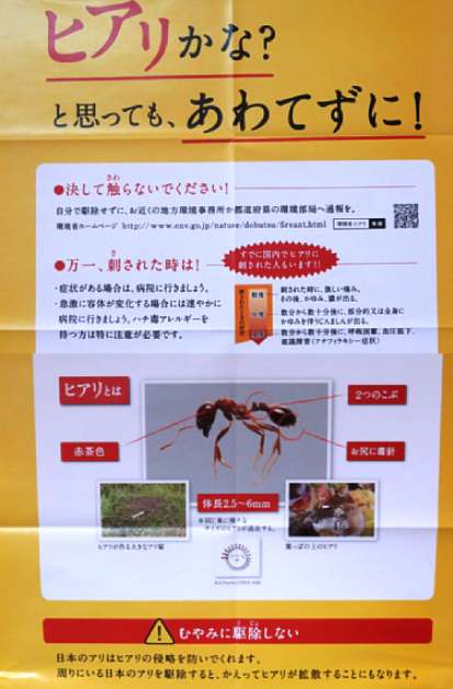 特定外来生物に指定されるヒアリについては、本年6月に兵庫県尼崎市で確認されて以降、兵庫県神戸市や大阪府大阪市など本市の近隣においても確認されていましたが、昨日(10月12日)京都府下でも「ヒアリ?(確認に3日ほどかかる)」と見られるアリが見つかったとの報道がされました。