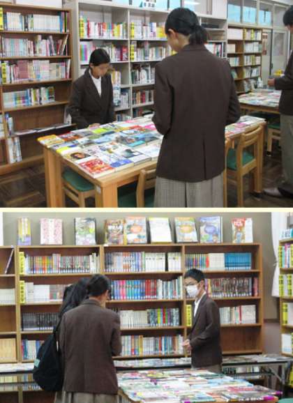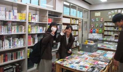 本日、図書司書の方にも来ていただき、選書会が図書室にて行われました。選書会は登校時、昼休み、放課後の時間帯に行われました。選書会に来た生徒は、図書室の机上に並べられた500冊ほどの本の中から気に入った本を選び、付箋を貼っていました。