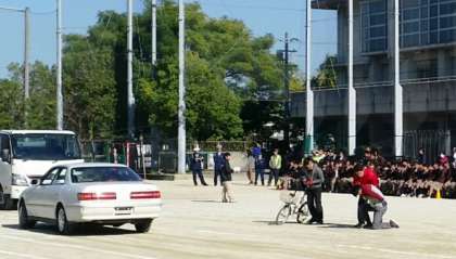 本日の5限、自転車安全教室が行われました。この安全教室は、ルール・マナーの「みえる化」の取り組みの一つとして、特に自転車事故の多い世代である中高生を対象に行われる、スケアード・ストレイト方式による安全教室です。