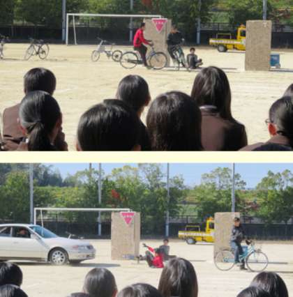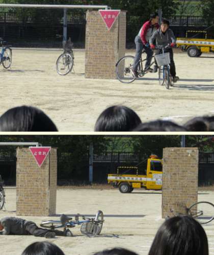 安全教室は、スタントマンが自転車事故(事故が起こったいくつものケース)を再現し、交通事故の恐ろしさや危険を認識させるとともに、交通ルールの遵守の重要性を訴える方法の安全教室です。