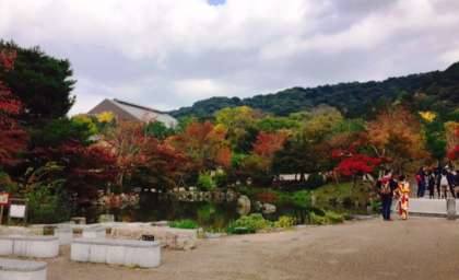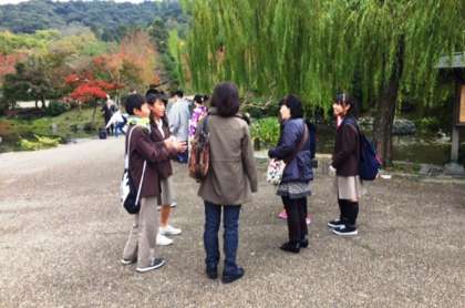 円山公園で公園に来られた方にインタビューをしています。紅葉もきれいですね。