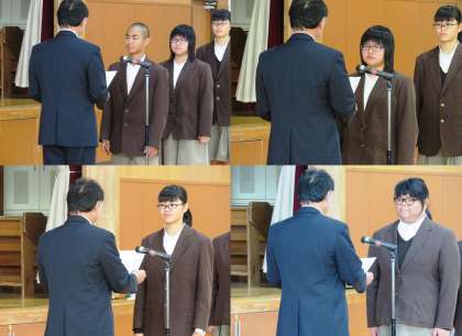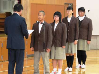 後期認証式に続き、「新人戦 柔道の部 50kg級 第2位」「京都市中学校総合文化祭朗読コンクール 優秀賞」「伏見区民文化祭・中学生作品展」「平成29年度京都市幼児児童生徒作品展」の表彰が行われました。