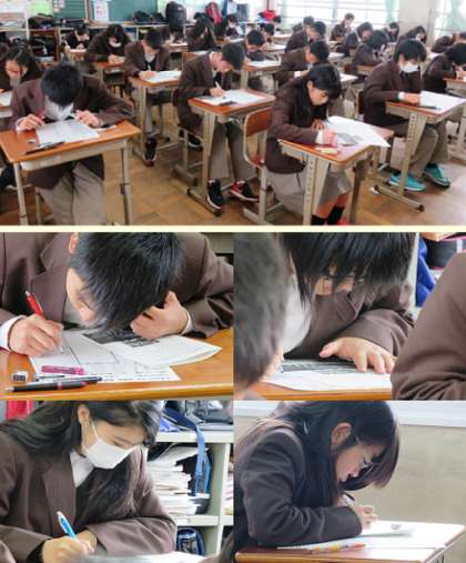 3限の音楽のテストの様子です。上から、2組、3組、4組 です。