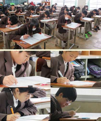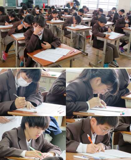 4限の保健体育のテストの様子です。上から、2組、3組、4組 です。