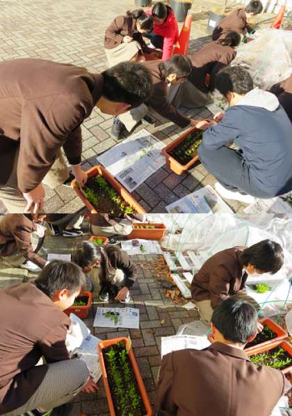 2年生は本日、家庭科の時間に調理実習を行います。1限に技術の時間に育てていた水菜を収穫し、調理実習に使います。水菜の収穫の様子です。