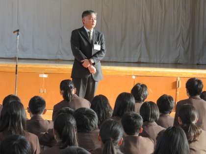 校長先生からは、「マラソン大会お疲れ様でした。それぞれが自分の全力を出し走ったこと(努力したこと)が大切である。3年生は受験に向けていつもと違う冬休みをしっかり過ごして下さい。全員には、健康に気をつけて冬休みを過ごしてほしい。」と話がありました。