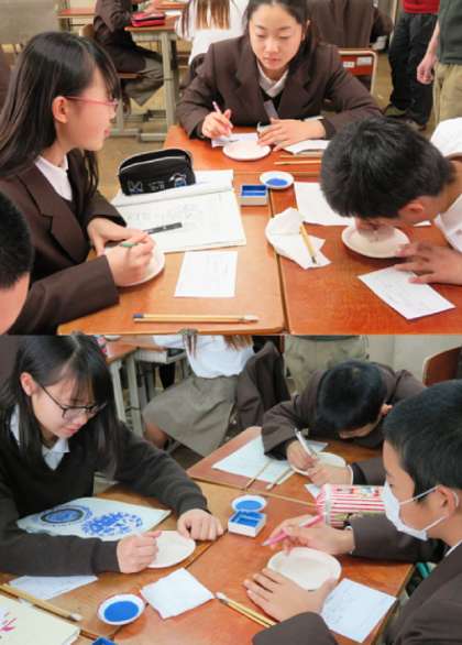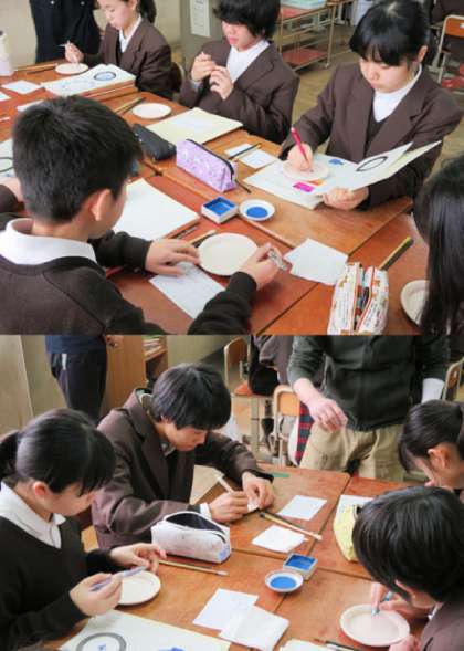 本日の5限、1年生は、京の「匠」ふれあい事業で、京都青窯会協同組合の皆さんに来ていただき、呉須(ごす)を使って、「お皿の絵付け体験」をしました。事前に、美術の時間に図案を考えて本日に挑みました。呉須はなかなか描きにくいので苦労したのではないかと思います。できあがりが楽しみですね。(1、2組の様子です)