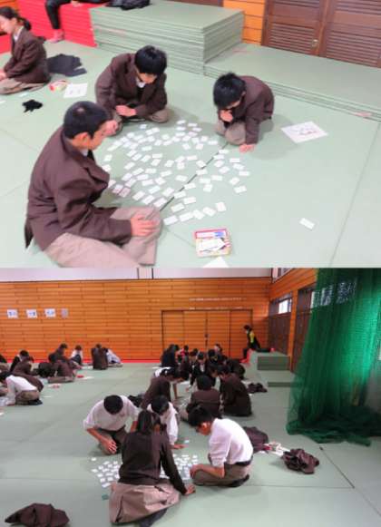 本日の5、6限を使って 1年生の百人一首大会がグループ別学級対抗の形で実施されました。係の生徒の司会で百人一首大会が始まりました。