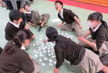 百人一首大会の様子です。最後の札が読み終わり、自分たちで集計をしています。