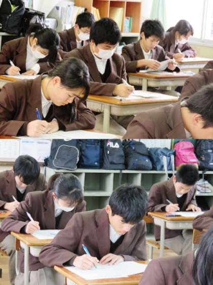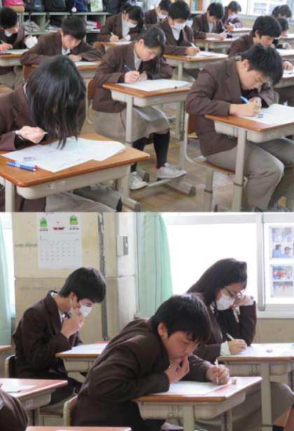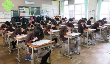 3限の保健体育のテストの様子です。みんな真剣です。4組です。