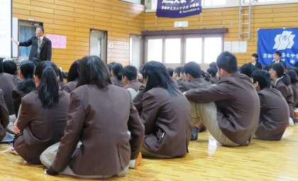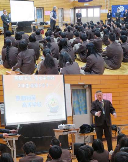 本日2年生は、5、6限に京都翔英高校の先生に来ていただき、進路セミナーと出前授業をしていただきました。5限の始めに学年の先生より高校の先生の紹介があり、進路セミナーが行われました。