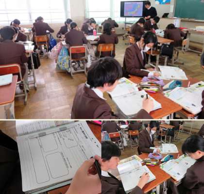 2限の授業の様子です。上から、2組 体育、3組 社会、4組 国語 です。