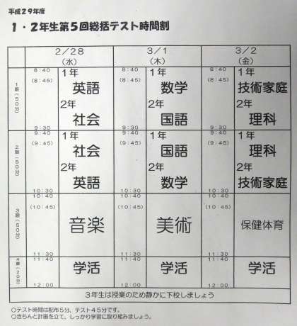 本日より、1・2年生は第5回総括テストの一週間前になります。しっかりと学習計画を立ててテスト勉強をして下さい。