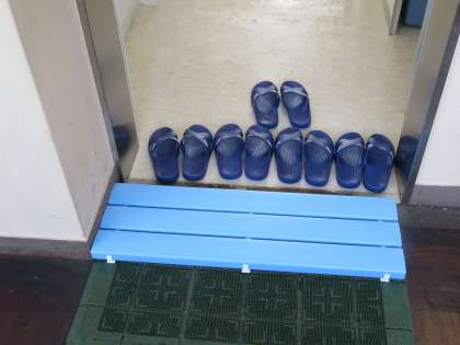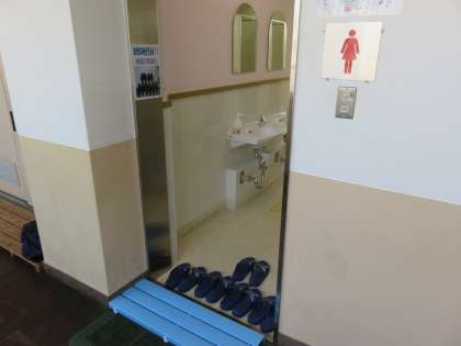 東校舎の新しいトイレのスリッパが変わりました。これまで、靴のまま履ける大きなスリッパでしたが、汚れが目立つようになってきましたので、二足制に代わりました。