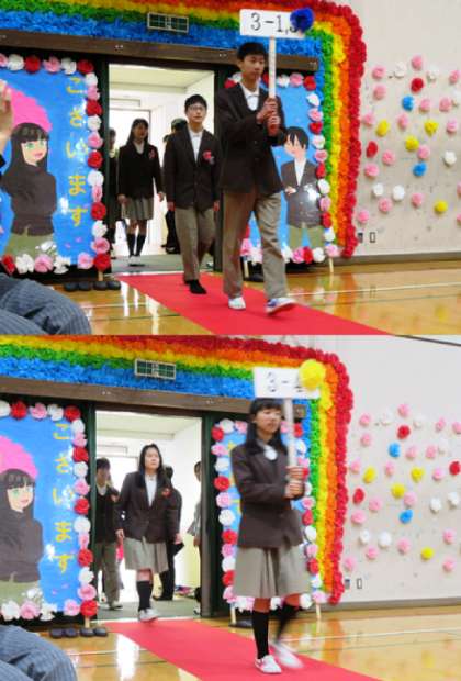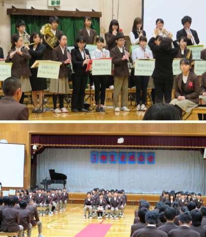 本日の2、3限に「3年生を送る会」が行われました。まずは、吹奏楽部の演奏で3年生が入場しました。