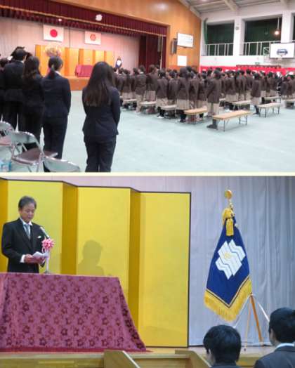入学式は、国歌斉唱に始まり、校歌斉唱、学校長式辞、来賓祝辞と入学式次第に沿って進みました。式辞の中では、初めに学校教育目標、目指す生徒像(自ら学び続ける力を持った生徒。生命を大切にし、思いやりの心を持った生徒。心身ともに健康で粘り強く生きる生徒。)に触れての話をされていました。