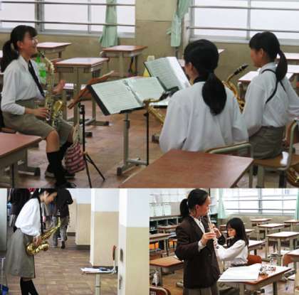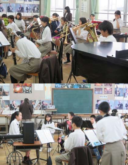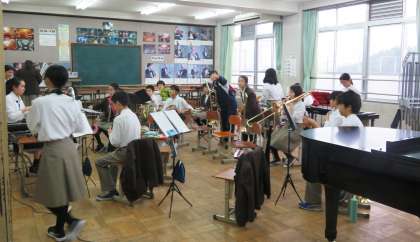 吹奏楽部の様子です。吹奏楽部は、4月29日に行われます伏見の集いに向けて頑張っていました。