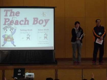 小中連携の一環で、本校英語科教員が納所小学校の全校集会に出向き、英語で「桃太郎」(The Peach Boy)を話しました。
