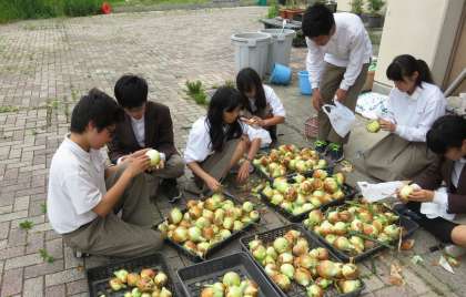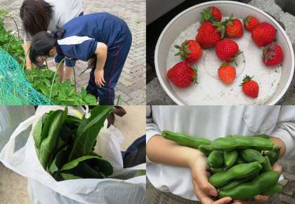 農園芸部の様子です。タマネギやいちごなどの収穫をしていました。