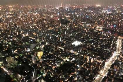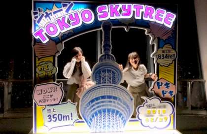 スカイツリーの展望台に到着しました。夜景がとてもきれいですね。真ん中の上に見えるのが、東京タワーでしょうか。