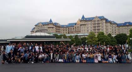 入場前に、ディズニーランドホテルをバックに全体の集合写真を撮りました。