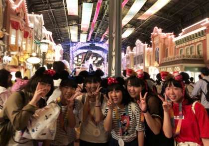 ディズニーランド内の様子です。集合まであとわずかです。おそろいのTシャツで集合してきたグループもあります。