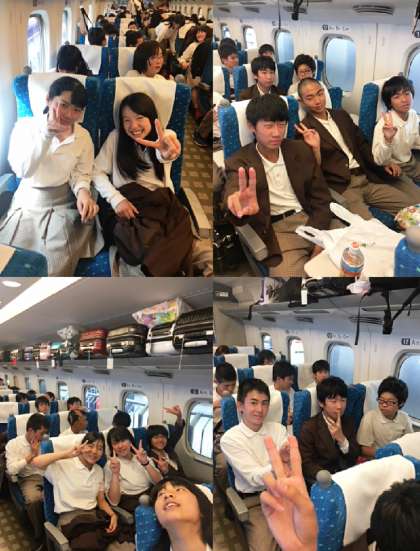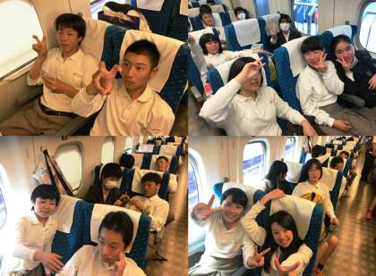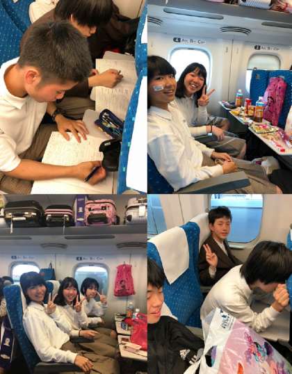 子どもたちは新幹線に乗車し14:00予定通り、京都に向けて出発しました。みんなお疲れのようですが、乗車していきなり、復習シートを始めた男子2人がいます。