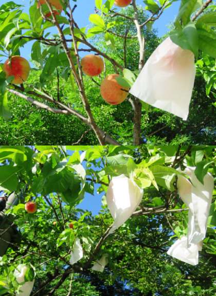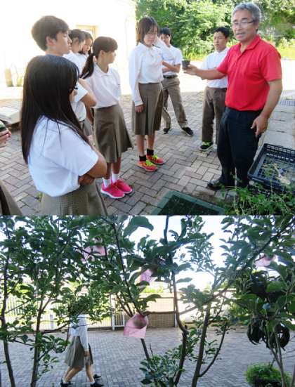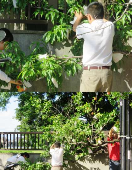 農園芸部の様子です。農園芸部は、校内にある桃やリンゴの実に袋をかぶせていました。
