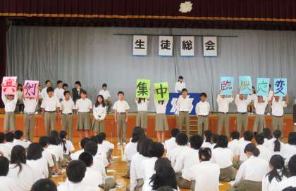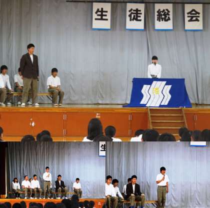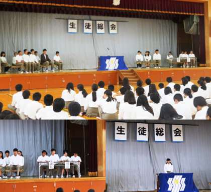 本日の午後、生徒総会が2部構成で行われました。前半は「今年度の委員会方針や生徒会予算について」、後半は「クラス紹介・学年アピール」です。