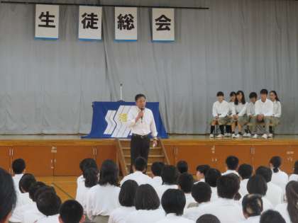 クラス紹介も終わり、校長先生の話、閉会宣言と流れ、生徒総会は終了しました。終わりの校長先生の話の中で、「生徒総会に触れられた後、震災に触れられ学校の内外での安全面に注意し、命を守るようにしなさい」と話をされました。蒸し暑い中でしたが、みんな真剣に聴く・発表をしていました。