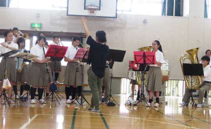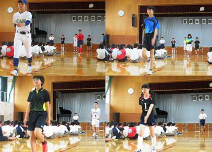 最後も吹奏楽部の演奏で選手が退場し、夏季大会激励会は終了しました。終了後、春季大会の表彰が行われました。続いて、校長先生からは明日の対応「気象警報に伴う臨時休校の措置について」の話がありました。また、各部の顧問の先生からも土日のことについて各部ごとに連絡もありました。