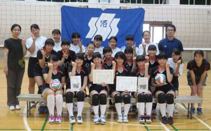 女子バレー部は、7月24日に洛南中学校で聖母学院中学校と対戦します。私たち3年生は1年生のときからコートには行って戦ってきましたが、なかなか結果を残すことが出来ませんでした。でも、この3年間、たくさん練習して頑張ってきました。3年間一緒に頑張ってきた仲間とともに、中学校生活最後の試合で悔いが残らないように、精一杯頑張りますので応援よろしくお願いします。